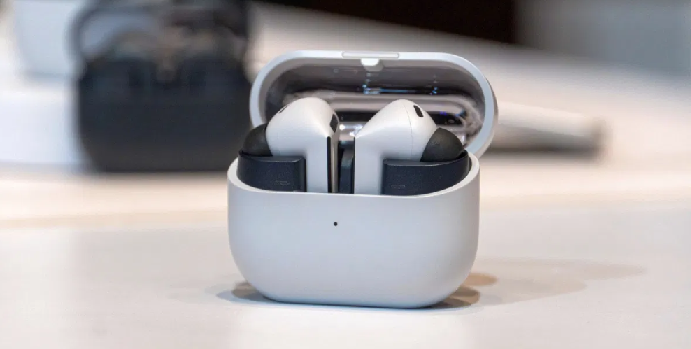 Galaxy Buds3 FE thừa hưởng các đặc điểm của 2 đàn anh Buds3 và Buds3 Pro khi có hộp sạc thiết kế oval có đế bằng với phần nắp hộp trong suốt thấy được tai nghe bên trong